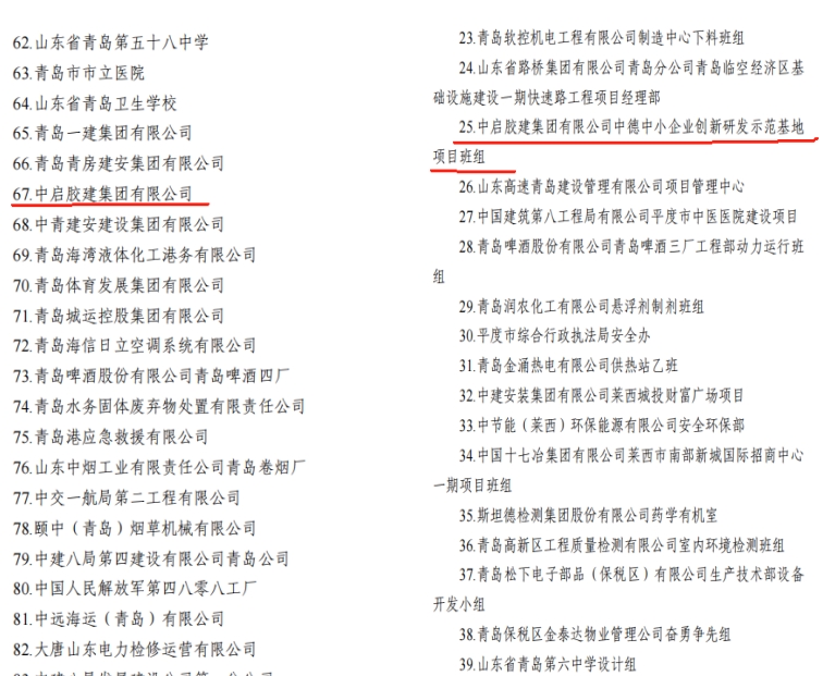 近日,青島市總工會、青島市應(yīng)急管理局、青島市衛(wèi)生健康委員會聯(lián)合公布了2022-2023年度全市“安康杯”競賽獲獎名單,中啟膠建集團(tuán)有限公司獲評青島市“安康杯”競賽優(yōu)勝單位,中德中小企業(yè)創(chuàng)新研發(fā)示范基地項(xiàng)目班組獲評青島市“安康杯”競賽優(yōu)勝班組。